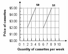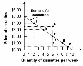 Answer: Two cassettes per week. The demand curve tells how much is demanded at each price. To determine the quantity demanded, find $4.00 on the vertical axis and read across until you meet the demand curve. Then read the quantity from the horizontal axis.
