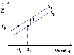 At every price level, less is supplied. For example, at price P0, originally Q0 is supplied. After the tax, Q1 is supplied at price P0.