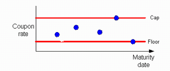 A floating-rate security may have upper and/or lower limits on the coupon rate. A cap is the maximum coupon rate of a floater. It is an attractive feature for the issuer since it limits the coupon rate. A floor is the minimum coupon rate, and it is an attractive feature for the investor. A collar is a floater with both a cap and floor.